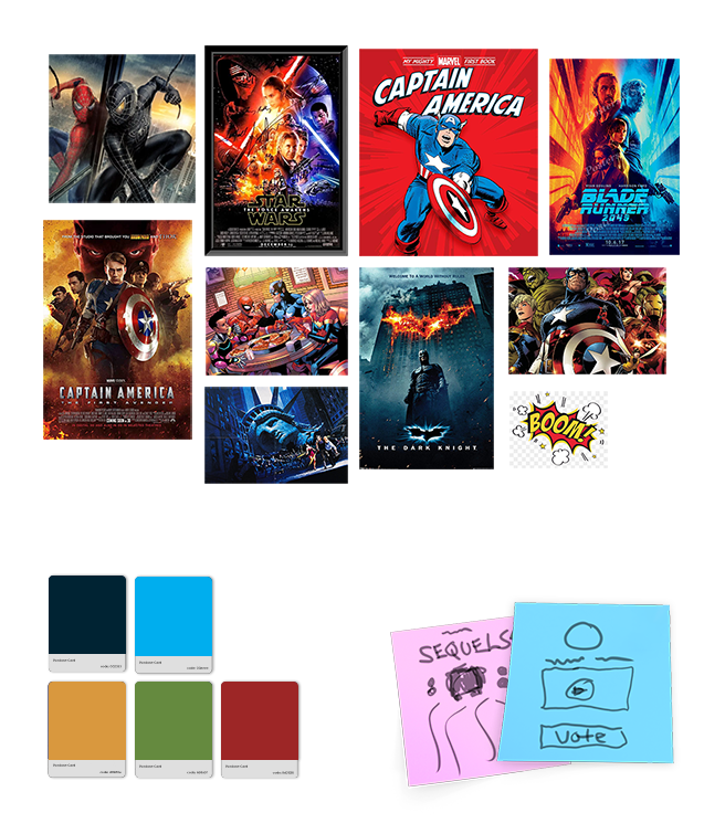 Drawing inspiration from the main commercial, we brainstormed ideas that aligned with the action-adventure themes. Subsequently, we delved into research and created mood boards that effectively conveyed the intended ideas and themes. The tone of the commercial, characterized by a blend of humor and action, guided my construction of a mood board featuring popular action movies and captivating comic book art. Given that our research indicated the significance of creating unique teams for each character to generate buzz, I focused on superhero action movies as they resonated strongly with their respective audiences.